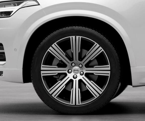볼보 XC90의 휠은 20인치, 21인치 총 2가지가 있습니다. 왼쪽은 20인치 10-스포크 블랙 다이아몬드 컷 휠, 오른쪽은 8 멀티 스포크 블랙 다이아몬드 컷 휠입니다.