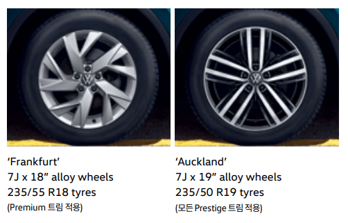 티구안 휠은 왼쪽 2개, 티구안 올스페이스 휠은 오른쪽 2개 휠입니다. 트림별로 적용되는 휠이 다르니 확인하시기 바랍니다.