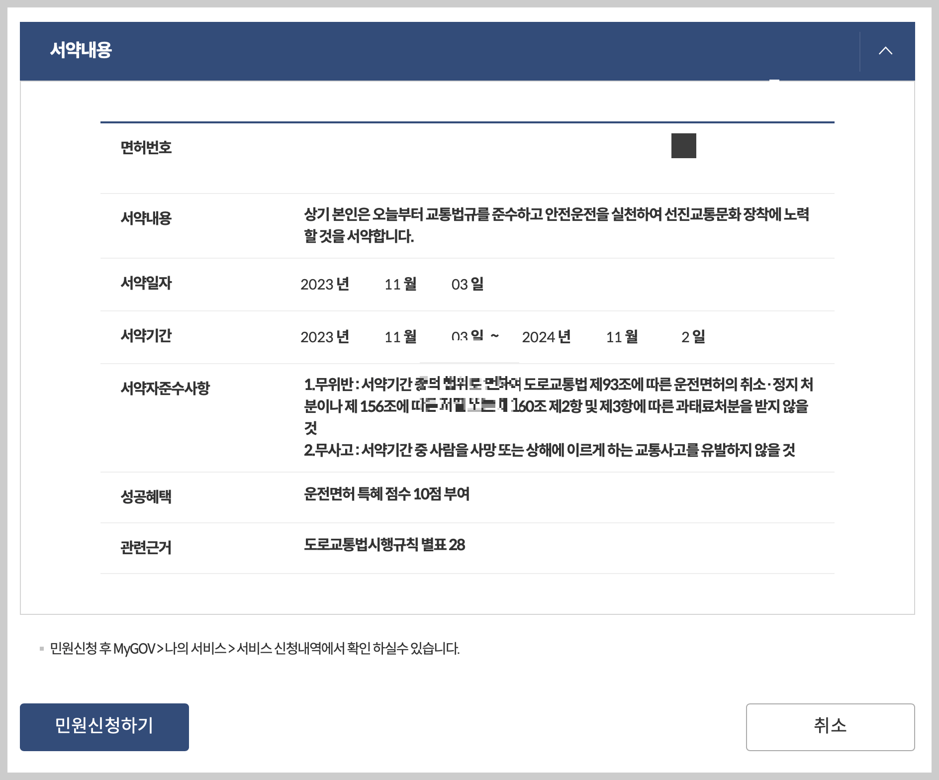 • 무사고, 무위반 서약을 지키지 않은 경우 신청이 취소될 수 있습니다.