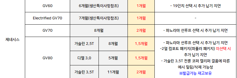 가솔린 3.5를 구매하시는 분들이 많으신데, 인기가 아직도 많아서 약 1년 가까이 기다려야 되네요. 최근 금리인상 등으로 취소하는 경우가 많아 출고가 조금 당겨지긴 한다고 하는데 한번 지켜봐야 될 듯합니다.