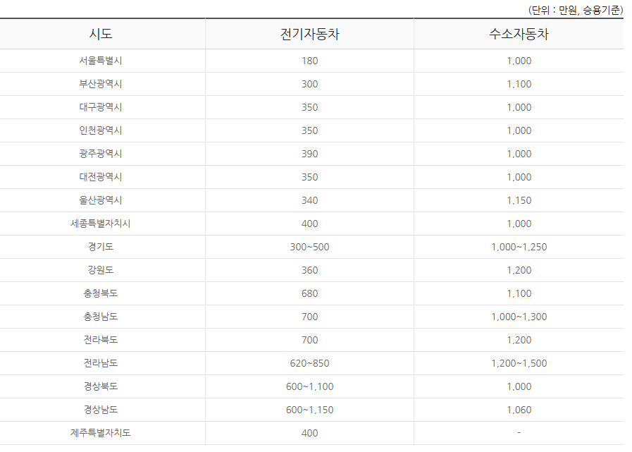 | 성능 보조금 | 초소형 최대 400만원 그 외 최대 600만원 |