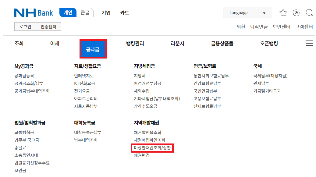 은행별로 조금 다를 수 있지만 대부분 "공과금"에 들어가시면 "미상환채권"을 조회할 수 있습니다.