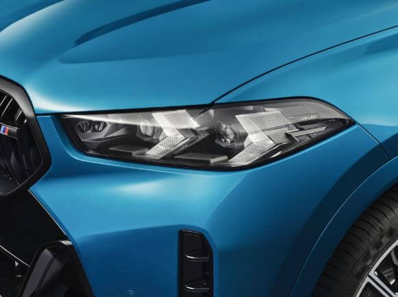bmw x6의 전면부입니다. 강렬한 인상을 주는 아이코닉 글로우 키드니 그릴입니다. 주행 중이나 차량 여닫을 때 LED가 켜져서 존재감을 강조합니다.