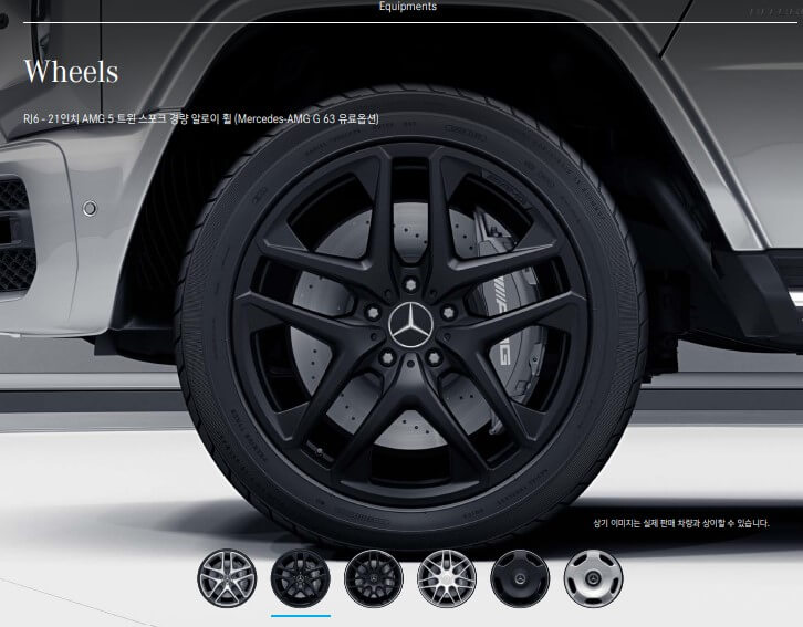 G바겐 400d 모델의 휠은 3가지, G바겐 63 AMG 모델의 휠은 6가지입니다. 트림별 기본적용되는 휠은 다르고, 옵션 추가 시 선택할 수 있습니다.