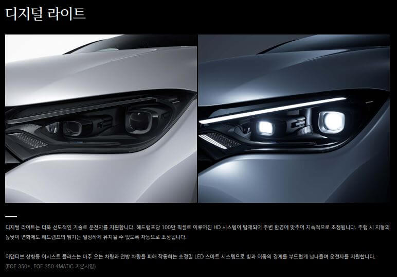 전면부 헤드라이트는 EQE 기본사양으로는 LED 고성능 헤드램프가 적용되며, EQE 350+, EQE 4 MATIC은 기본사양으로 디지털 라이트가 적용됩니다.