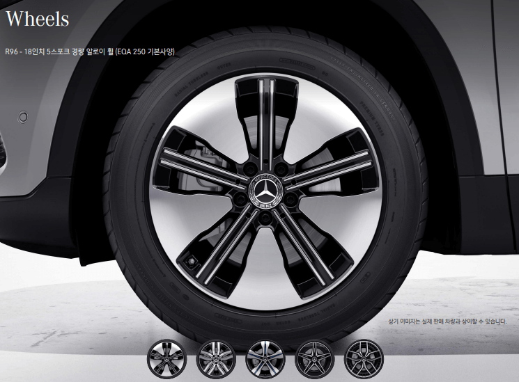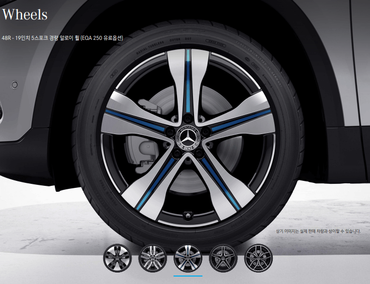 위 3가지 휠은 EQA 250 휠입니다. 첫 번째 휠이 기본 휠이고, 두 번째, 세 번째는 유료옵션입니다.