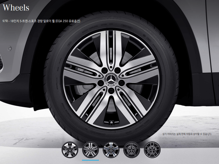위 3가지 휠은 EQA 250 휠입니다. 첫 번째 휠이 기본 휠이고, 두 번째, 세 번째는 유료옵션입니다.