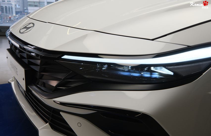 스타리아, 그랜저, 코나 등 일자형 DRL이 현대자동차의 패밀리 룩이 된 것처럼, 이번 아반떼에서도 유사하게 적용된 것을 볼 수 있습니다. 다만, DRL 램프가 일자로 점등되지는 않고, 라디에이터 그릴 상단에 크롬가니시 장식으로 일자형 DRL처럼 보이게 디자인되었습니다.