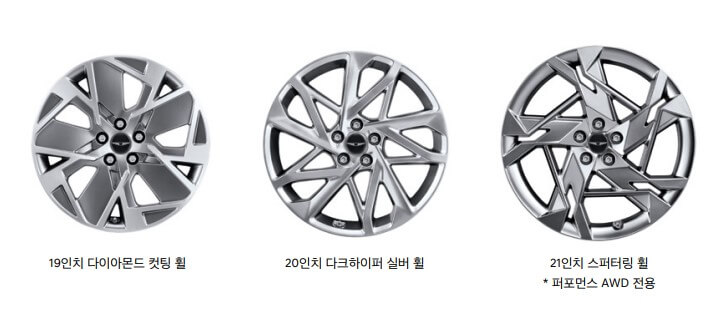 GV60 전기차의 휠은 19인치, 20인치, 21인치 3가지가 있습니다. 21인치는 퍼포먼스 AWD 전용이니 참고하세요.